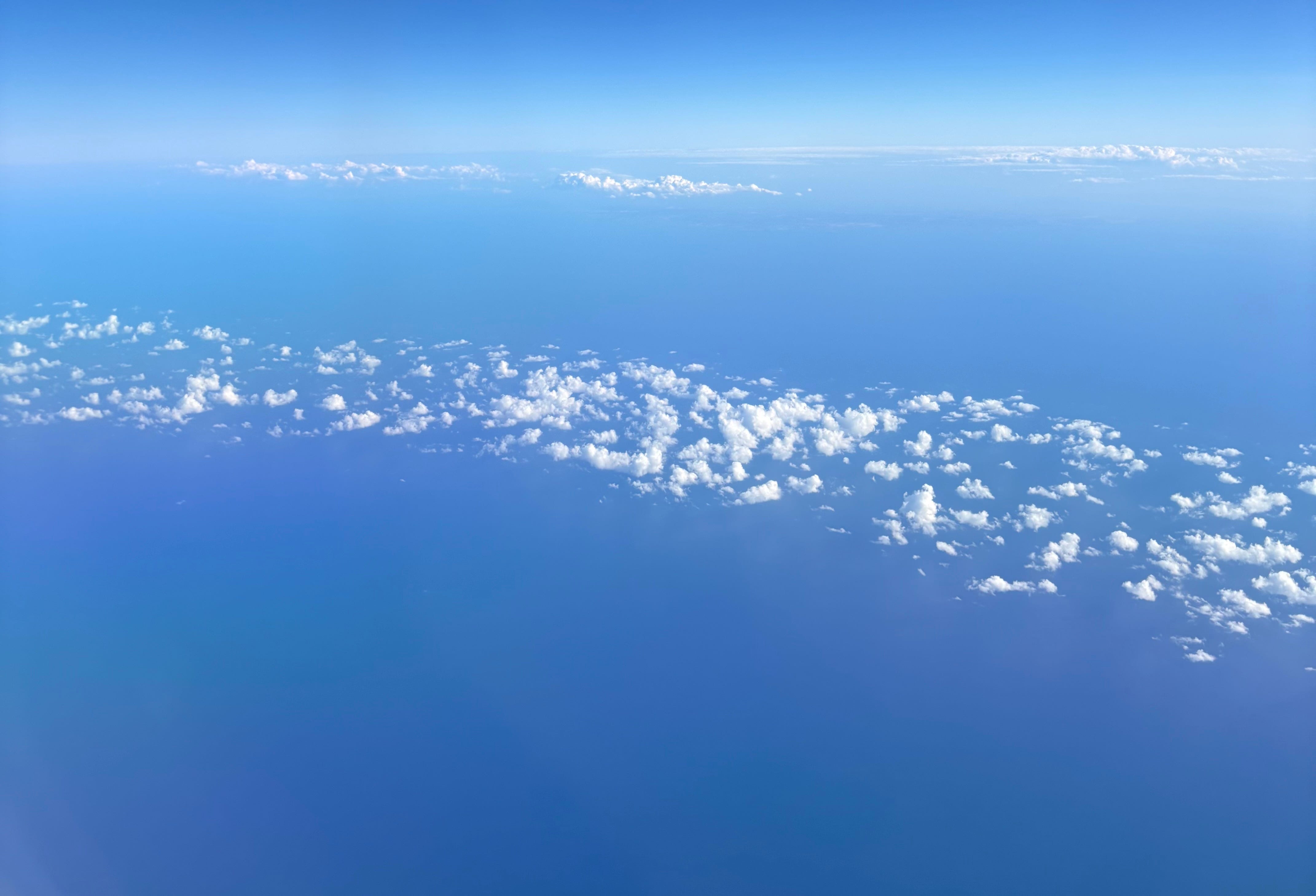 Din avion, marea pare un lac imens și liniștit, cu mici puncte albe, valuri ce-i întrerup albastrul fin, unduindu-se ca o mătase atinsă de vânt.